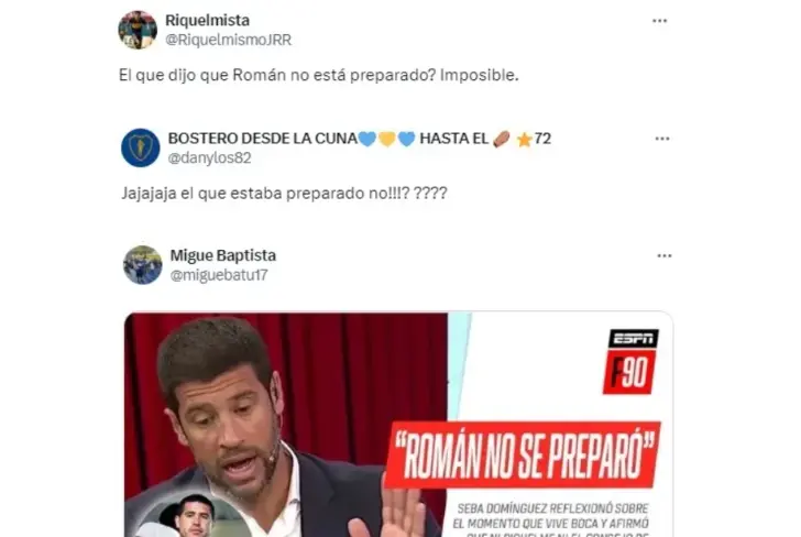 Resulta que hace unos años atrás, el ex jugador de Vélez había mencionado que Juan Román Riquelme “no estaba preparado” para el rol de dirigente en el conjunto de la Ribera. Ahora, los fanáticos del conjunto azul y oro aprovecharon la oportunidad para apuntar en contra de Domínguez y en redes sociales lo liquidaron: “El que dijo que Román no está preparado? Imposible”, “Lo afilado y preparado que está Seba”, “¿Qué difícil es cuando uno no está preparado no?”, fueron algunos de los comentarios.