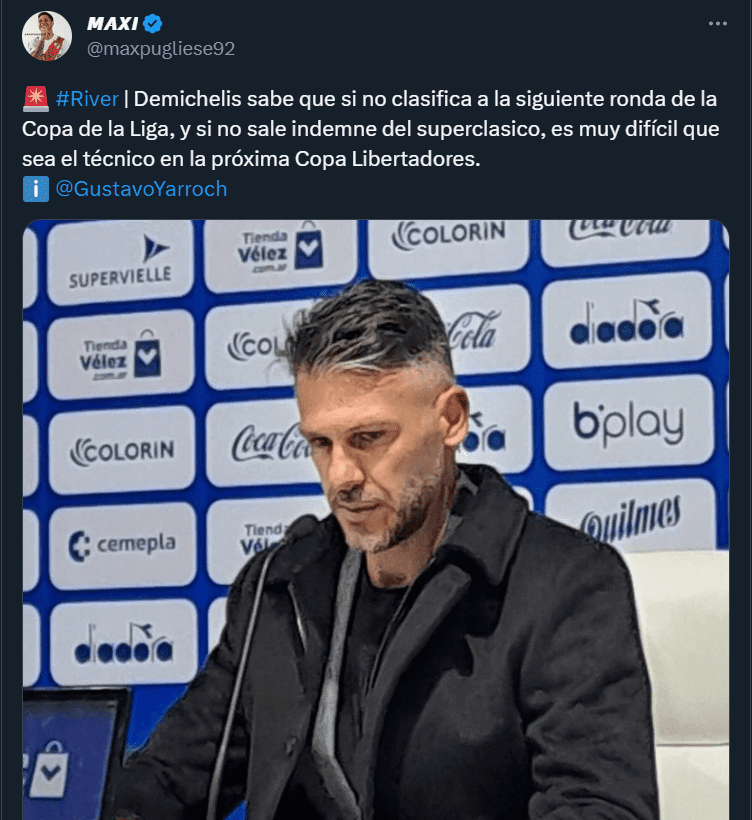 Las gallinas están viviendo un momento crítico dentro de la temporada y todo parece indicar que Demichelis está caminando sobre la cornisa. Según pudo informar el periodista Gustavo Yarroch, “Demichelis sabe que si no clasifica a la siguiente ronda de la Copa de la Liga, y si no sale indemne del superclasico, es muy difícil que sea el técnico en la próxima Copa Libertadores”. En este contexto, si Boca se queda con el clásico, el DT dejará River.