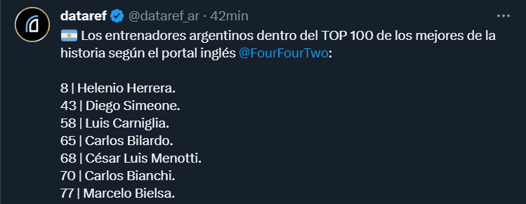 Resulta que la prestigiosa revista inglesa llamada Four Four Two realizó un ranking de los mejores 100 entrenadores en toda la historia del fútbol. Dicho top está integrado por 7 entrenadores argentinos y para sorpresa de muchos, sobre todo para los hinchas de River, no se encuentra Marcelo Gallardo. Por otro lado, como era de esperarse, Carlos Bianchi sí integra dicha lista y se encuentra en la posición N° 70 a nivel mundial.