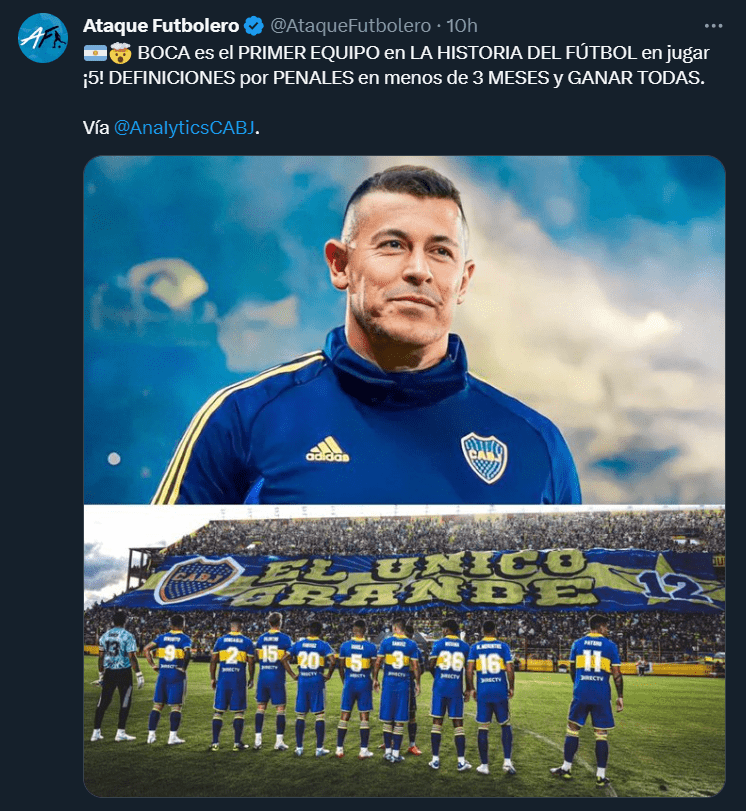 Según pudo informar la cuenta de X especializada en datos del Xeneize, @AnaIyticsCABJ, “Boca es el primer equipo en la historia del fútbol en jugar ¡5! definiciones por penales en menos de 3 meses y ganar todas”. Resulta que todas las tandas de penales que Boca jugó en este 2023, fueron para el conjunto azul y oro. Con estos datos, cualquier equipo que se enfrente al Xeneize sabe que no tiene que ir a penales, ya que prácticamente es una derrota asegurada.