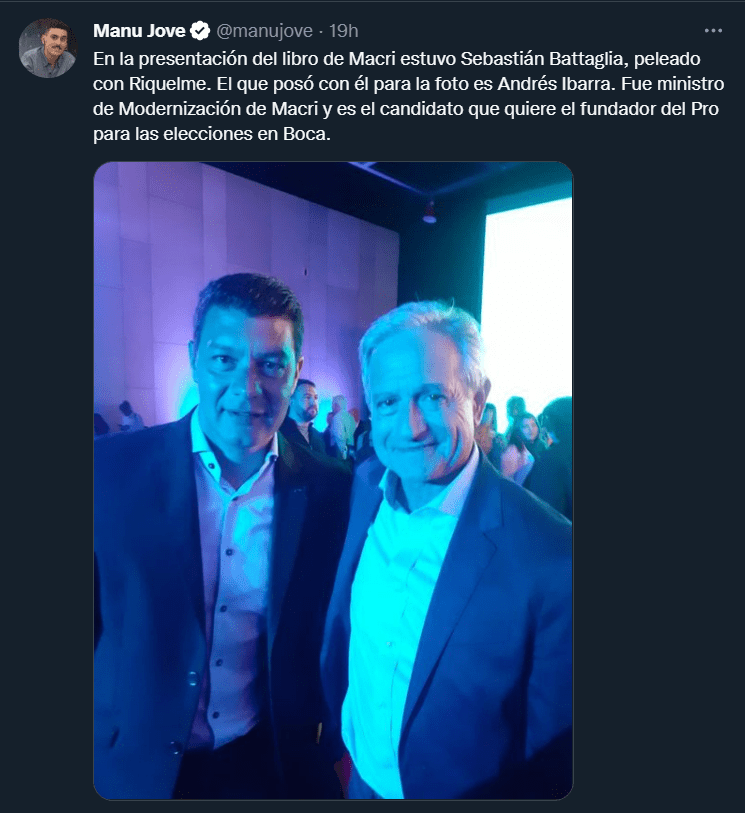 "En la presentación del libro de Macri estuvo Sebastián Battaglia, peleado con Riquelme. El que posó con él para la foto es Andrés Ibarra. Fue ministro de Modernización de Macri y es el candidato que quiere el fundador del Pro para las elecciones en Boca", comentó el periodista en Twitter. ¿Será que Battaglia se suma a la oposición?