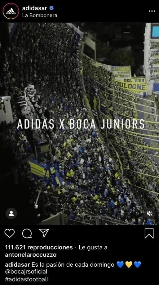 La página oficial de Adidas Argentina subió una publicación donde se puede observar a La Bombonera. Todo normal hasta acá, pero los fanáticos del Xeneize estuvieron atentos y pudieron notar que Antonela Roccuzzo reaccionó a dicha publicación con un ‘me gusta’, algo que volvió locos a los hinchas y que comenzaron a vincularla tanto a ella como a Lionel Messi con el club de la Ribera.