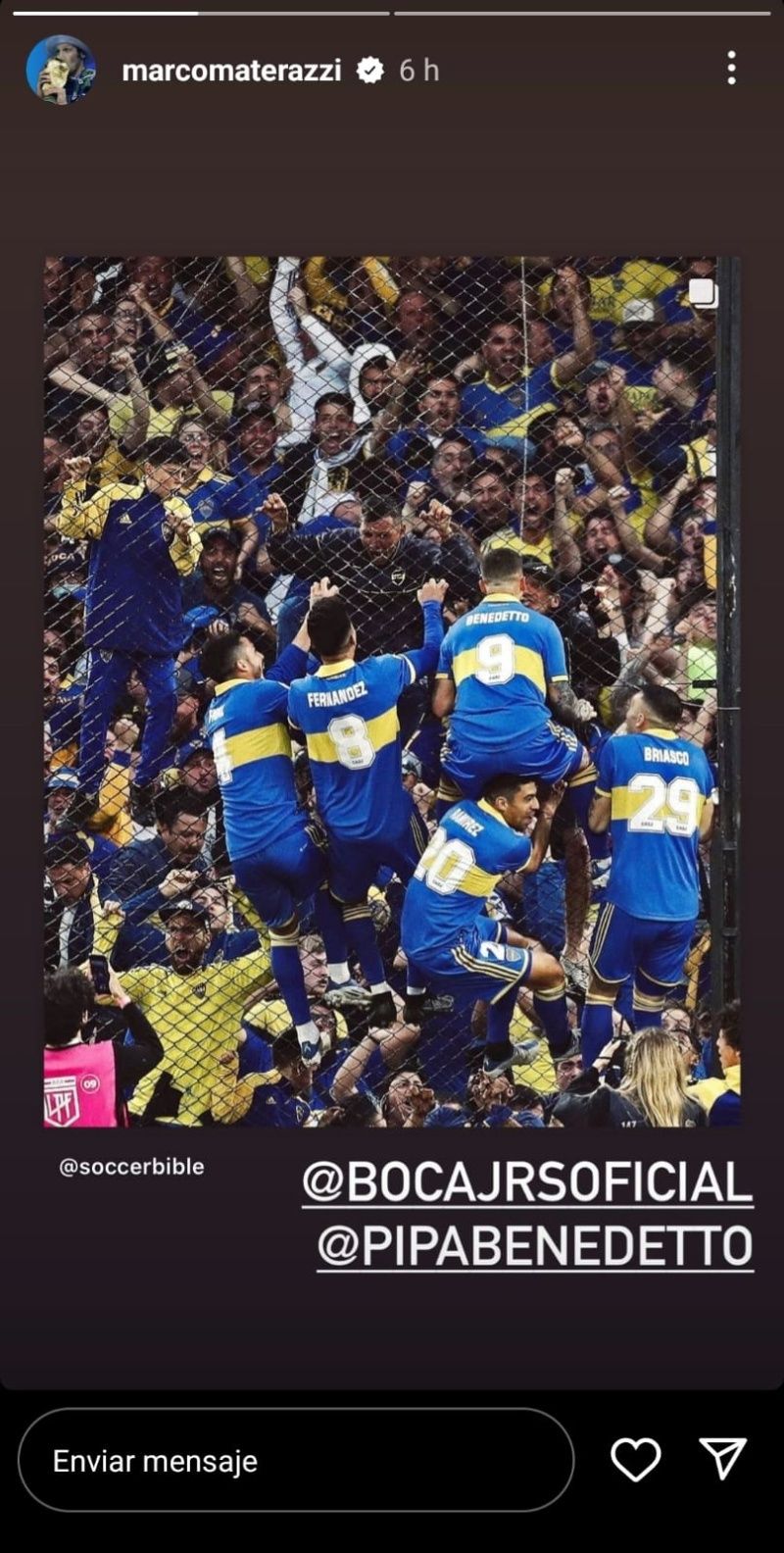 El defensor fue otro de los jugadores internacionales que estuvo atento a lo que sucedía en el clásico entre Boca y River. Tras el triunfo, el italiano no ocultó su fanatismo por el club de la Ribera y decidió exponer su alegría en redes sociales. Mediante su cuenta de Instagram, Materazzi compartió una publicación del festejo de los jugadores en el alambrado y etiquetó a la cuenta de Boca y a Darío Benedetto.