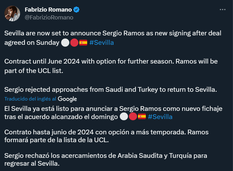 Según pudo informar el periodista Fabrizio Romano, el ex Real Madrid regresará al club que lo vio nacer y fichará por el Sevilla de España. “El Sevilla ya está listo para anunciar a Sergio Ramos como nuevo fichaje tras el acuerdo alcanzado el domingo”, menciona y luego agrega: “Contrato hasta junio de 2024 con opción a una temporada más. Ramos formará parte de la lista de la UCL”.