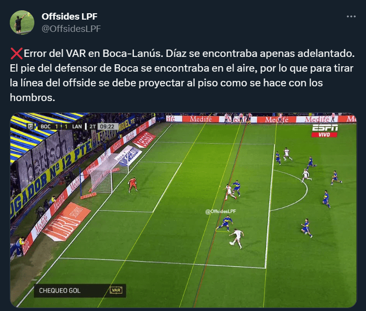 Según informó el usuario de X, @OffsidesLPF, el cuerpo arbitral del VAR cometió un error al convalidar el gol de Díaz, ya que el delantero se encontraba apenas adelantado. “El pie del defensor de Boca (Figal) se encontraba en el aire, por lo que para tirar la línea del offside se debe proyectar al piso como se hace con los hombros”, explica el usuario donde además, deja una foto donde se puede ver a la perfección que el jugador del Granate se encontraba en fuera de juego.