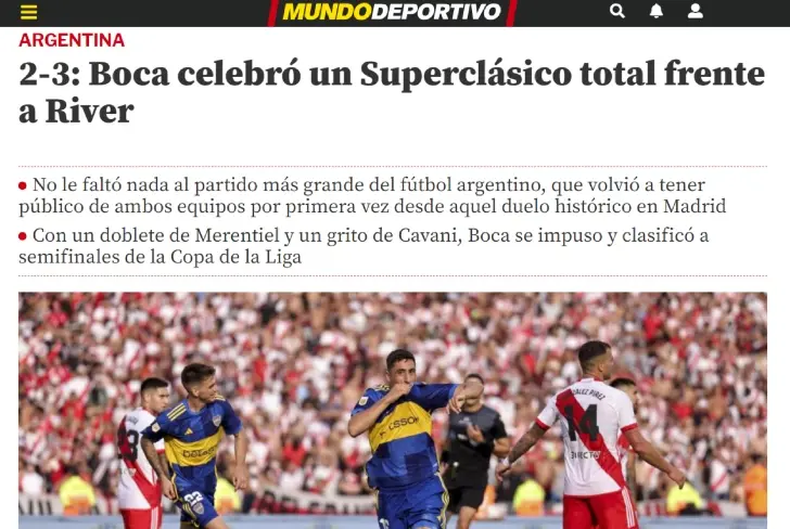 Yéndonos hacia Italia, Corriere dello Sport menciona ”caos en el Superclásico” con ”la intervención del VAR que no resolvió las dudas sobre el episodio sin la ayuda de la tecnología de línea de gol”. Finalmente, desde Portugal, el medio A Bola hizo énfasis en el resultado: ”Este domingo, Boca Juniors ganó el Superclásico argentino con River Plate y se clasificó a las semifinales de la V edición de la Copa de la Liga”.