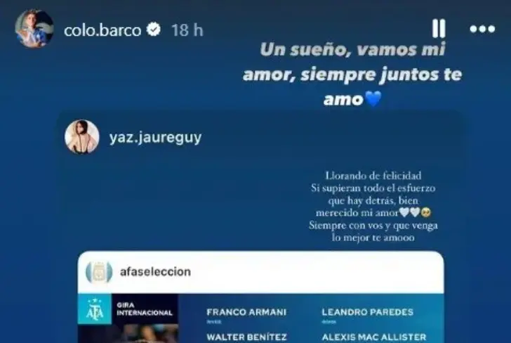 Lo cierto es que un tiempo más tarde, llegó la respuesta de Barco, quien escribió lo siguiente: “Un sueño. Vamos mi amor, siempre juntos. Te amo“. De esta manera, el 'Colo' tendrá su primera participación en la Selección Argentina donde compartirá vestuario con Lionel Messi y compañía. Un salto bastante grande para el joven que hace unos años jugaba en la Reserva de Boca y no tenía oportunidad en la Primera.