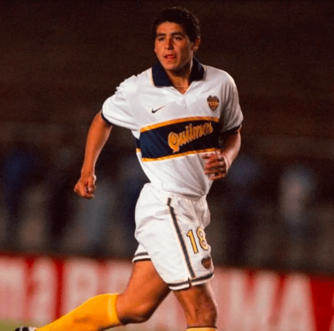 La nueva indumentaria tiene ribetes similares a la que pudo usar Juan Román Riquelme en 1997, en esta foto llamativamente usando el número 18.