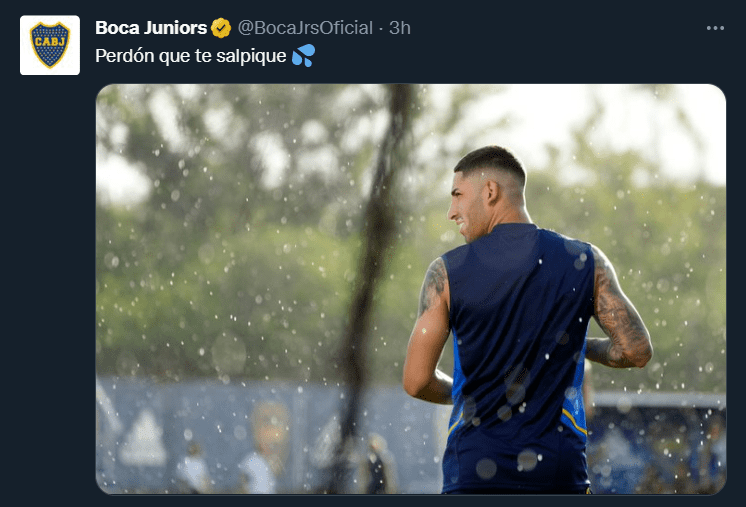Como mencionamos, el Xeneize utilizó la frase que hace referencia al ídolo del FC Barcelona para subirla pero con otro contexto. En su cuenta de Twitter, Boca publicó una imagen donde se lo ve a Alan Varela en el medio del agua donde salpicaban los regadores del campo y adjunto, escribió: “Perdón que te salpique”, increíble.