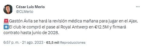 Tras haberse ganado un lugar en el conjunto belga e incluso haber sido citado por Lionel Scaloni en alguna oportunidad, Gastón Ávila mantuvo buenos rendimientos y despertó el interés del Ajax de Ámsterdam, que puso el dinero para llevárselo a Países Bajos. Según informó el periodista espcializado en fichajes César Luis Merlo, el club neerlandés le compró su pase al Royal Antwerp en 12.5 millones de euros y el argentino firmará su contrato por cinco años.