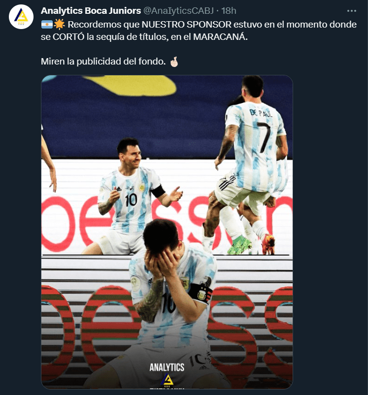 Durante estos últimos días, una imagen de Lionel Messi festejando la obtención de la Copa América 2021 comenzó a recorrer las redes. Allí se lo ve al ‘10’ festejando y detrás, un cartel de 'Betsson', el nuevo sponsor de Boca. Además, se lo ve a Rodrigo De Paul con la camiseta N°7, haciendo referencia a la séptima. Por último hay que destacar que están festejando en el Estadio Maracaná, estadio donde se llevará a cabo la final de la Copa Libertadores.