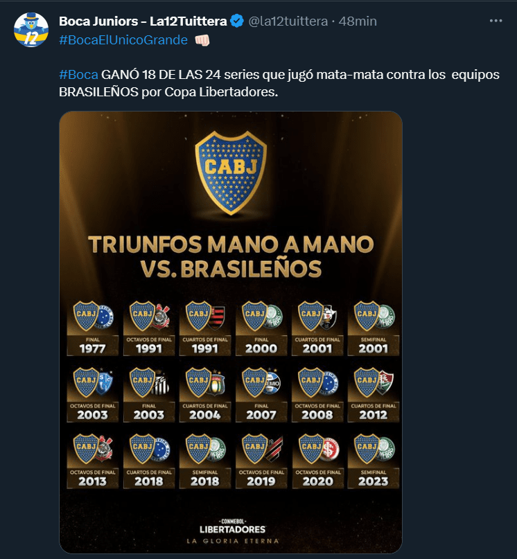 Además, Boca es el equipo que más goles le marcó a Palmeiras en Copa Libertadores, llegando a 15 tantos con el de Edinson Cavani. Pero eso no es todo, ya que el cuadro de La Boca demostró ser el papá de todo Brasil y es que desde que se creó la Copa Libertadores, el Xeneize jugó 24 series de eliminación directa contra equipos brasileños. De esas 24 series, Boca avanzó a la siguiente ronda en 18 ocasiones, habiendo perdido solamente 6 cruces a lo largo de su historia.
