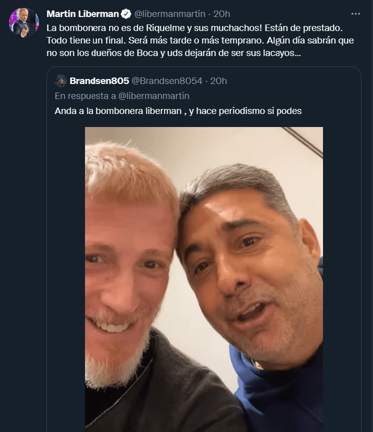 "La Bombonera no es de Riquelme y sus muchachos! Están de prestado. Todo tiene un final. Será más tarde o más temprano. Algún día sabrán que no son los dueños de Boca y ustedes dejarán de ser sus lacayos…", publicaba el reportero en su cuenta de Twitter, a modo de descarga. Todos sabemos de que lado está Liberman, y con estos dichos no hace falta ni aclararlo.