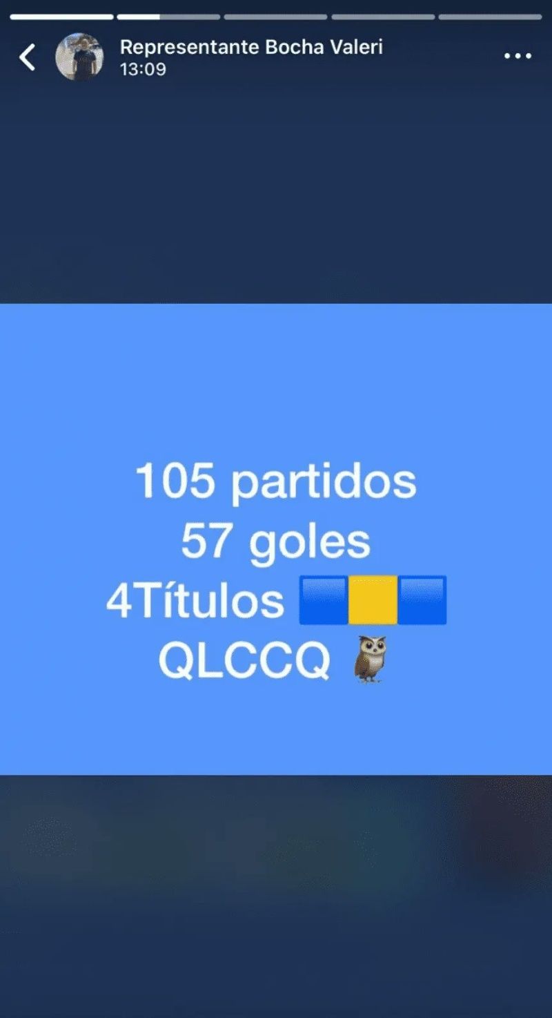 El agente del Pipa salió a defender al delantero en su estado de Whatsapp y subió una historia donde se puede observar el mensaje de: “105 partidos, 57 goles, cuatro títulos”, remarcando los números del jugador con la camiseta de Boca. "Que la cuenten como quieran (QLCCQ)", agregó finalmente tras la sanción de su jugador.