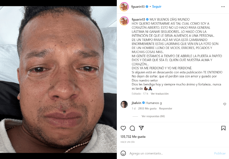El ex jugador de 36 años decidió expresar públicamente sus sentimientos y en su cuenta de Instagram publicó: “Hoy quiero mostrarme así tal cual como soy a corazón abierto, esto no lo hago para generar lástima ni ganar seguidores. Lo hago con la intención de que le sirva al menos a una persona. De un tiempo para acá mi vida está cambiando enormemente. Estas lágrimas que ven en la foto son de un hombre lleno de vicios, errores, pecados y muchas cosas mas”.