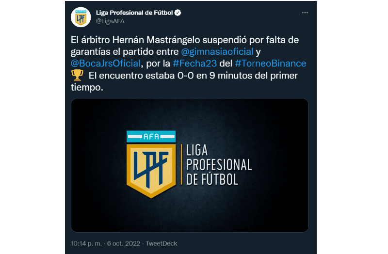 El fútbol argentino volvió a protagonizar un hecho desafortunado y este ha sido uno de los más grandes de la historia en los últimos años. Boca y Gimnasia debían jugar por la fecha N°23 de la Liga Profesional durante la noche de este día jueves, pero el partido tuvo que ser suspendido a los 9 minutos de haber comenzado.