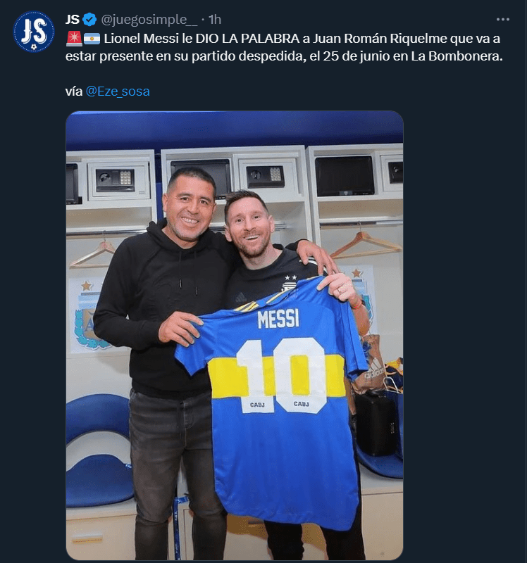 Este próximo 25 de junio se hará el partido de despedida de Juan Román Riquelme en la Bombonera y claramente, Lionel Messi fue invitado. Según reveló el periodista Ezequiel Sosa, el ‘10’ ya habría contestado: “Lionel Messi le dio la palabra a Juan Román Riquelme que va a estar presente en su partido despedida, el 25 de junio en La Bombonera”, informó el cronista.