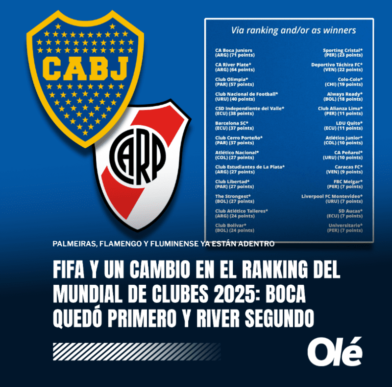 FIFA determinó que se tomarán en cuenta el rendimiento de las últimas cuatro ediciones de la Copa Libertadores, es decir, 2021, 2022, 2023 y 2024 la cual terminará confeccionando una tabla general en la que los dos mejores equipos posicionados se clasificarán al Mundial de Clubes. Se computarán 3 puntos por victoria, 1 por empate y 0 por derrota. Además, también recibirán 3 puntos por participar en la fase de grupos y otros 3 por cada ronda avanzada. En este sentido, Boca es el líder de la tabla con 71 puntos, pero no depende de sí mismo, ya que no jugará la edición del año que viene.