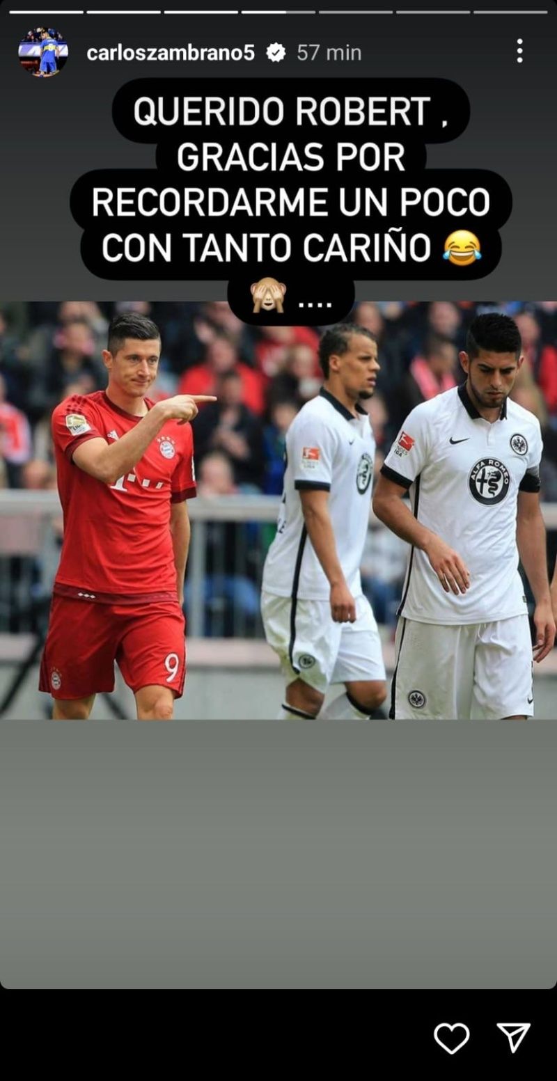 Además, en su propia cuenta de Instagram, Zambrano decidió dedicarle un par de historias al atacante del Barcelona. En las mismas se pueden observar el mensaje de: “Querido Robert, gracias por recordarme un poco con tanto cariño”, en tono burlón. “Como sabes esto es fútbol amigo: siempre jugamos muy fuerte y dejamos la vida en nuestros cruces… nunca con malicia”.