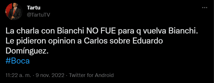 Según informó el periodista Augusto Tartúfoli, Riquelme y Bianchi tuvieron una conversación, pero la misma no fue para acordar una posible vuelta para sustituir al ‘Negro’ Ibarra. "La charla con Bianchi NO FUE para que vuelva Bianchi. Le pidieron opinión a Carlos sobre Eduardo Domínguez", confesó el cronista. ¿Será que Boca irá en busca del ex Independiente?