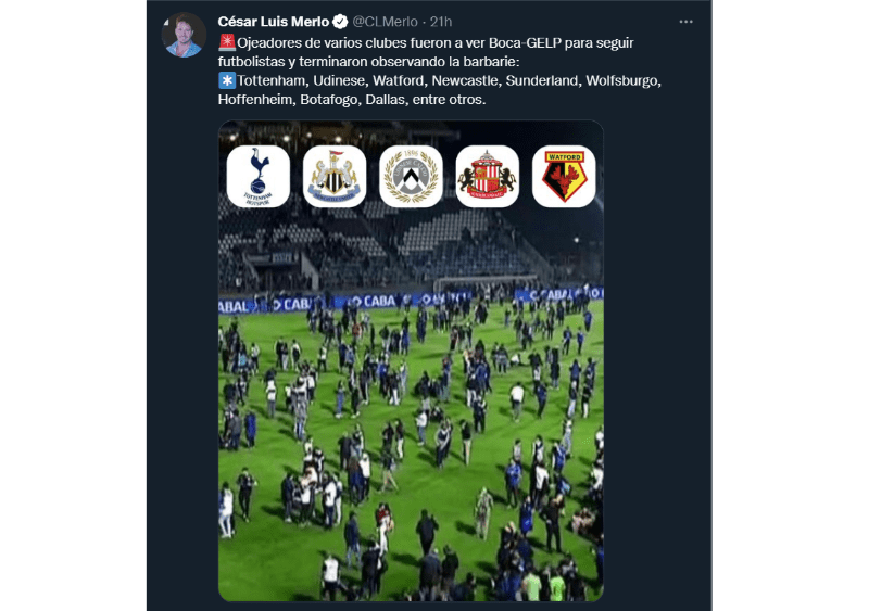 Según pudo informar el periodista César Luis Merlo: “Ojeadores de varios clubes fueron a ver Boca-Gimnasia para seguir futbolistas y terminaron observando la barbarie: Tottenham, Udinese, Watford, Newcastle, Sunderland, Wolfsburgo, Hoffenheim, Botafogo, Dallas, entre otros”. Una noche que será para el olvido de muchos.