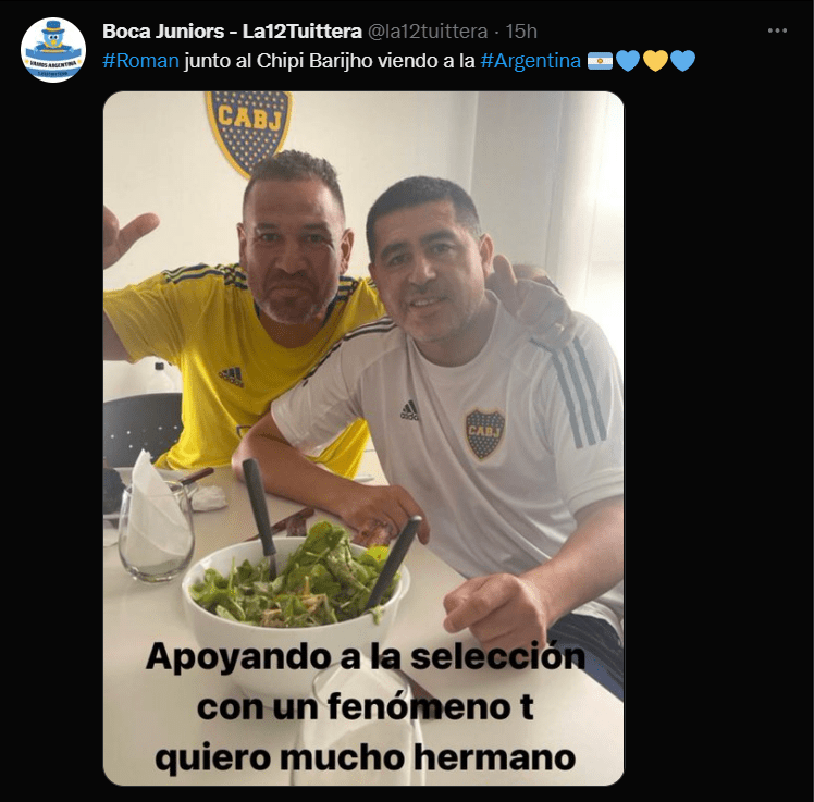 “Apoyando a la Selección con un fenómeno. Te quiero mucho, hermano. Vamos Argentina”, fue lo que escribió el ‘Chipi’ en su cuenta oficial de Instagram. En la imagen se los puede ver a ambos con la indumentaria de Boca puesta en el predio de Ezeiza y con ensalada de por medio, disfrutando el show que nos brindó el equipo de Lionel Messi durante la tarde del miércoles.