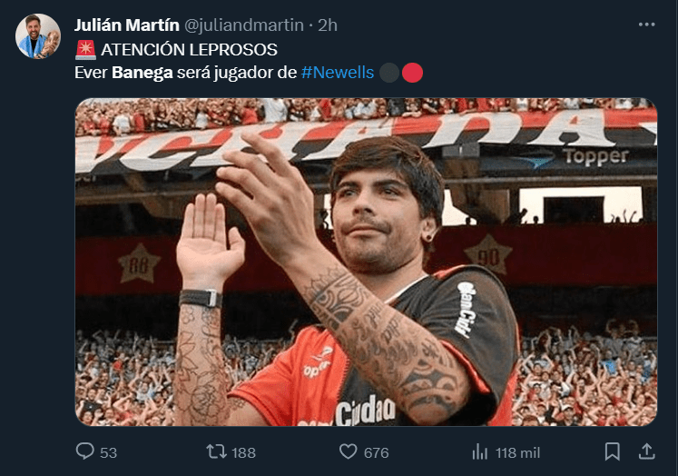 De acuerdo a la información que brinda el periodista de Twitter, @Info_BosteraOk, “si Banega va a Newell's no es por el sueldo, tampoco por amor, es por otros temas que son preferibles no meterse”, sentenció dejando mucha tela que cortar. Luego, en otro tuit, el cronista expresa: “El tema es saber si realmente puede elegir el jugador...”. En este sentido, en los comentarios empezaron a especular con una posible extorsión por parte de la barra de la Lepra o incluso la aparición de posibles amenazas. Creer o reventar.