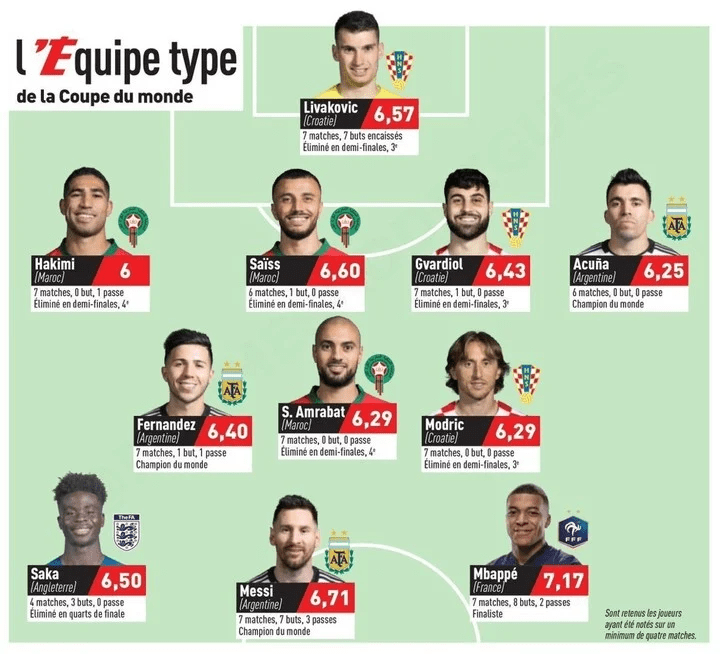 Con las ausencias de Emiliano Martínez (recibió el premio al mejor arquero de la competición) y de Alexis Mac Allister o Julián Álvarez quienes fueron grandes figuras, hay que sumar la decisión que tomaron con Kylian Mbappé. Según la revista francesa, el delantero de Les Bleus fue el mejor de la competición teniendo una mayor puntuación a la de Messi, su principal competidor.