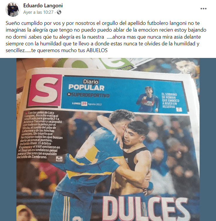 "Sueño cumplido por vos y por nosotros. El orgullo del apellido futbolero Langoni. No te imaginas la alegría que tengo, no puedo hablar de la emoción. Recién estoy bajando. No dormí. Sabés que tu alegría es la nuestra. Ahora más que nunca. Mirá hacia delante, siempre con la humildad que te llevó a donde estás. Nunca te olvides de la humildad y sencillez. Te queremos mucho. Tus abuelos", escribió Eduardo.