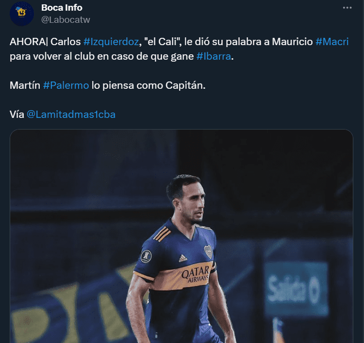 Según pudo informar la cuenta de X, @Lamitadmas1cba, Carlos Izquierdoz le habría dado su palabra a Mauricio Macri para volver a Boca, en caso de que Andrés Ibarra sea el vencedor en las elecciones. Recordemos que durante la jornada de hoy se llevarán a cabo los sufragios en la Bombonera, apra determinar cuál será la fuerza que tome las riendas del club a partir de enero de 2024. Ibarra estará del lado de la oposición, mientras que Juan Román Riquelme estará del lado del oficialismo.