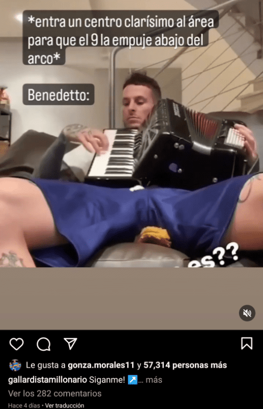 La publicación se trata de un video donde se lo puede ver a Benedetto tocando un acordeón, junto con el siguiente mensaje: "*Entra un centro clarísimo al área para que el 9 la empuje abajo del arco*", seguido de “Benedetto:”. Ahí es donde aparece el ‘me gusta’ de Morales, quien está a favor de la burla hacia Benedetto.