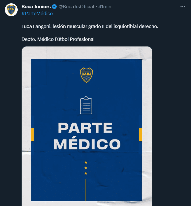 Según informó la cuenta oficial de Boca en X, Langoni sufrió una lesión muscular de grado II del isquiotibial derecho. Esto significa que el jugador de 21 años podría estar entre 3 y 5 semanas fuera del campo de juego. Se perdería los cuartos de final de la Copa Libertadores contra Racing, los octavos de final de Copa Argentina y posiblemente el clásico frente a River en la Bombonera.