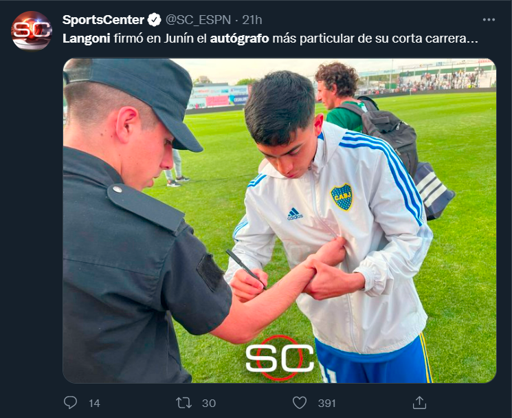 El chico de Laferrere se convirtió en una pieza clave de Boca y es una de las figuras del Torneo Local, es por esto, que una vez finalizado el partido ante el ‘Verde’ se vivió una situación muy particular. Mientras el plantel del Xeneize se retiraba del campo de juego, un policía se acercó hacia Langoni para pedirle un autógrafo, pero en su brazo.
