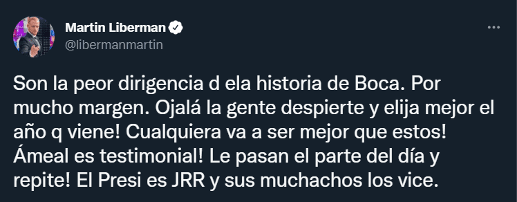 El jornalista siempre fue muy duro con la actual dirigencia, estando en contra de Juan Román Riquelme y sus allegados. Así se lo pudo observar en sus redes sociales en varias ocasiones, tirando en contra del “10” y su mandato. Ahora se lo vio con su amigo, el “Tano”, todo queda más que claro.