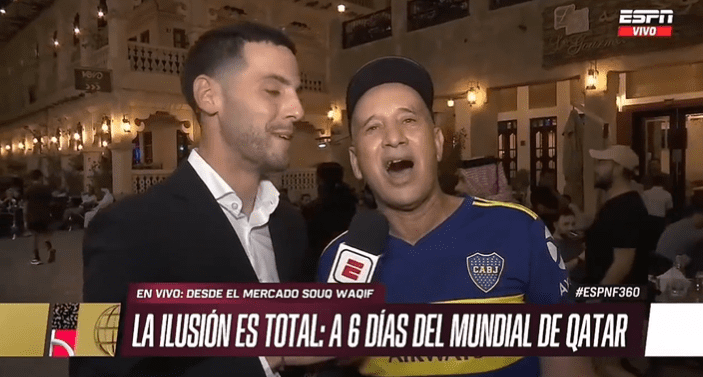 Allí fue donde ESPN realizó una cobertura en el Mercado de Souq Waqif, ubicado en Doha, dicho lugar es conocido por sus puestos de ropa tradicional, artesanías y recuerdos. Allí también se encuentran decenas de restaurantes y el medio se encontró con un qatarí con ¡la camiseta de Boca puesta! El periodista claramente le quiso hacer una pequeña nota, pero rápidamente contestó con: “Dale, dale dale Boca…”, increíble.