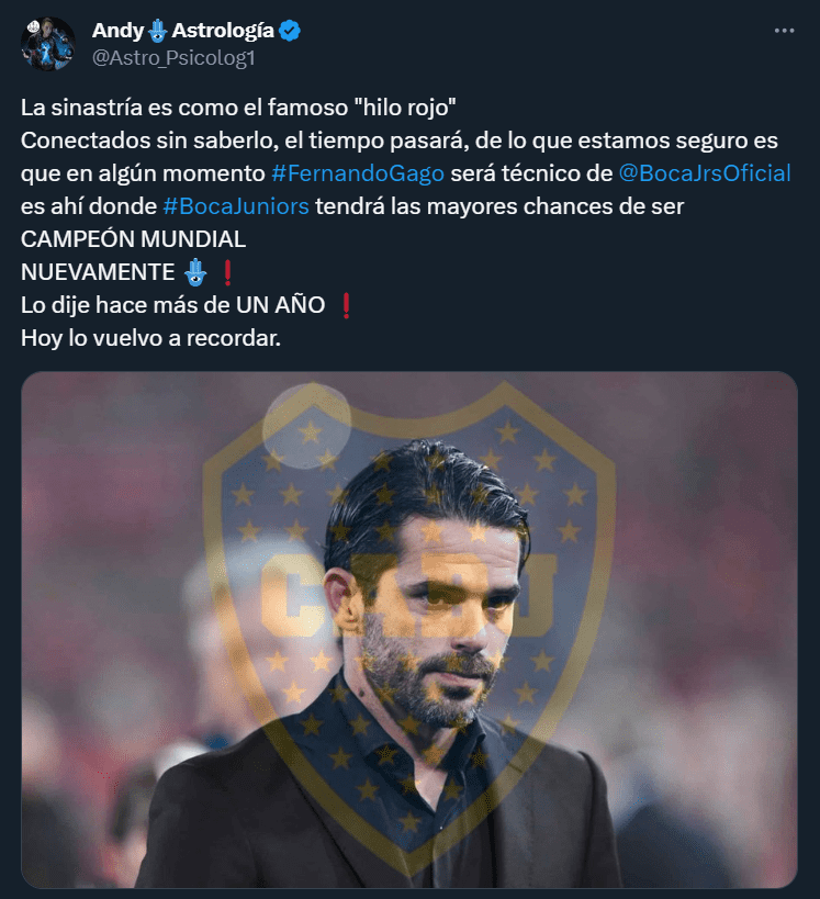 Sin embargo, en las últimas horas se pudo conocer que, según la astrología, hay un DT que podría sacar a Boca campeón del mundo en un futuro. Según el usuario de X, @Astro_Psicolog1, el cual es un reconocido astrólogo de la plataforma, anunció: "Conectados sin saberlo, el tiempo pasará, de lo que estamos seguro es que en algún momento Fernando Gago será técnico de Boca Juniors. Es ahí donde Boca Juniors tendrá las mayores chances de ser campeón mundial nuevamente".