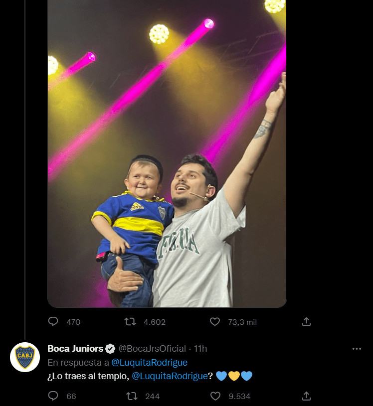 El streamer argentino, Luquita Rodríguez, compartió una imagen en sus redes donde se lo pueden ver a él junto con Hasbulla en sus brazos y con la camiseta de Boca puesta. El Xeneize no se quedó atras y su cuenta oficial de Twitter comentó la imagen y expresó: “Lo traes al templo, @LuquitaRodrigue?”.